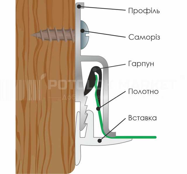 - Служить для монтажу в профіль, кріпиться за допомогою шпателя або, виключаючи ймовірність пошкодження полотна, вручну;
